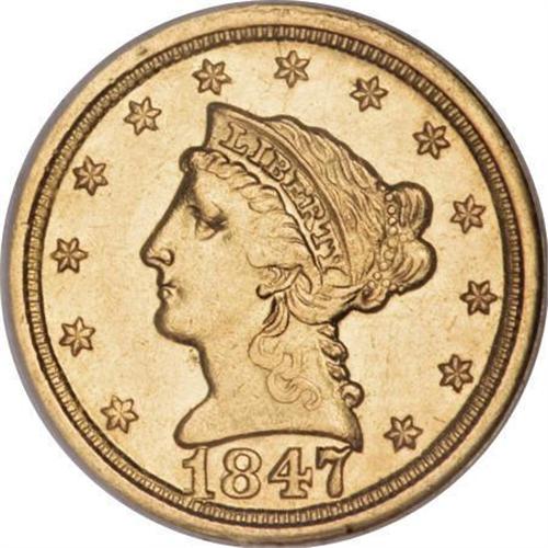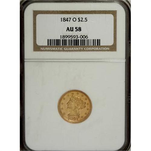 <B>1847-O $2 1/2 AU58 NGC.</B></I> Doug Winter states that the 1847-O quarter eagles are "among the most poorly struck New Orleans gold coins." While the current piece displays strike weakness on the central obverse details, it is relatively well struck in other areas. Peach-gold coloration and pleasing surfaces define this near-Mint State example.<BR><BR><B>Coin Engraver:</B> Christian Gobrecht<BR><BR><b>Shipping:</b> Coins & Currency (<a target="_blank" href="http://www.heritageauctions.com/common/shipping.php">view shipping information</a>)
