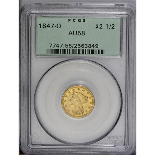 <B>1847-O<$2 1/2> AU58 PCGS.</B></I> A trace of highpoint friction keeps this lustrous piece from Mint State. Nicely struck with seemingly undisturbed yellow-gold fields. Housed in a green label holder. Population: 5 in 58, 10 finer (8/06).