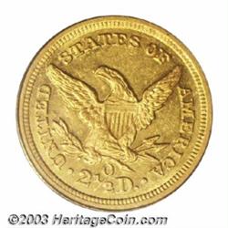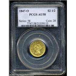 <table><tr><td><TABLE cellSpacing=0 cellPadding=0 width="100%" bgColor=#000000 border=0><TBODY> <TR><TD width="100%"><TABLE cellSpacing=1 cellPadding=3 width="100%" border=0><TBODY><TR><TD width="100%" bgColor=#79735c><FONT face=arial color=#ffffff size=3><B>Description</B> </FONT></TD></TR><TR><TD width="100%" bgColor=#ffffff><FONT face=arial size=2><B>1847-O $2 1/2 AU58 PCGS.</B></I> The '47-O is a scarce New Orleans Quarter Eagle that is much more challenging than its mintage of 124,000 pieces would indicate. It is especially difficult in Almost Uncirculated condition, a small number of Uncirculated coins are known, but these are mostly cleaned pieces that came from a small hoard that entered the market in early 1985. This piece is unusually well struck in the centers with bright yellow-gold surfaces that retain a good portion of the original mint luster. We see no singularly mentionable abrasions on either side of this near-mint piece.<BR><I>From The New Millennium Collection.</B></I> </FONT></TD></TR></TBODY></TABLE></TD></TR></TBODY></TABLE><BR><A name=PricesRealized></A><TABLE cellSpacing=0 cellPadding=0 width="100%" bgColor=#000000 border=0><TBODY><TR><TD width="100%"><TABLE cellSpacing=1 cellPadding=3 width="100%" border=0><TBODY><TR><TD width="100%" bgColor=#79735c><A name=PR><FONT face=arial color=#ffffff size=3><B>Previous Prices from Heritage Auctions</B> </FONT></A></TD></TR><TR><TD bgColor=#f6f6ed><TABLE cellSpacing=0 cellPadding=0 width="100%" border=1><TBODY><TR><TD align=middle width="33%"><B>Date</B></TD><TD align=middle width="33%"><B>Service</B></TD><TD align=middle width="33%"><B>Price</B></TD></TR><TR bgColor=whitesmoke><TD width="33%"><B>10/04/1997</B></TD><TD width="33%">PCGS</TD><TD width="33%">$1,540.00</TD></TR></TBODY></TABLE></TD></TR><TR><TD bgColor=#ffffff><FONT face=arial size=1 ?>PLEASE NOTE: All prices realized reflect the final hammer price PLUS the buyer's premium in auctions that charge a buyer's premium. Each item has a notation at the top of the listing indicating whether that lot included a buyer's premium. Example: A item that sells with a final hammer price of $100 and a 20% buyer's premium will display with a price realized of $120. All information listed is intended to be as accurate as possible, but errors are possible. Please use this guide carefully and inform us of any inaccuracies. </FONT></TD></TR></TBODY></TABLE></TD></TR></TBODY></TABLE><BR><TABLE cellSpacing=0 cellPadding=0 width="100%" bgColor=#000000 border=0><TBODY><TR><TD width="100%"><TABLE cellSpacing=1 cellPadding=3 width="100%" border=0><TBODY><TR><TD width="100%" bgColor=#79735c colSpan=6><FONT face=arial color=#ffffff size=3><B>Price Guide*</B> </FONT></TD></TR><TR bgColor=#f6f6ed><TD align=middle><B>Grade</B> </TD><TD align=middle><B>Coin World<BR>(Trends)</B> </TD><TD align=middle><B>Numismedia<BR>Retail</B> </TD><TD align=middle><B>Numismedia<BR>Wholesale</B> </TD><TD align=middle><B>Coin<BR>Universe</B> </TD><TD align=middle><B>Heritage<BR>Value Index</B> </TD></TR><TR bgColor=#ffffff><TD align=middle>55</TD><TD align=right>$2,200.00</TD><TD align=right>---</TD><TD align=right>$1,750.00</TD><TD align=right>$1,525.00</TD><TD align=right>$1,376.17</TD></TR><TR style="FONT-WEIGHT: bold" bgColor=#cccfdd><TD align=middle>58</TD><TD align=right>$3,000.00</TD><TD align=right>---</TD><TD align=right>$2,425.00</TD><TD align=right>---</TD><TD align=right>$1,965.98</TD></TR><TR bgColor=#ffffff><TD align=middle>60</TD><TD align=right>$4,650.00</TD><TD align=right>---</TD><TD align=right>$4,150.00</TD><TD align=right>$4,225.00</TD><TD align=right>$2,850.83</TD></TR><TR bgColor=#ffffff><TD colSpan=6><FONT size=1>*All information listed is intended to be as accurate as possible, but errors are possible. No item may be returned or refused based on this information which is provided as a service to our customers. You should contact each pricing source directly to determine the accuracy of this information. </FONT></TD></TR></TBODY></TABLE></TD></TR></TBODY></TABLE><BR><TABLE cellSpacing=0 cellPadding=0 width="100%" bgColor=#000000 border=0><TBODY><TR><TD width="100%"><TABLE cellSpacing=1 cellPadding=3 width="100%" border=0><TBODY><TR><TD width="100%" bgColor=#79735c><FONT face=arial color=#ffffff size=3><B>Population Guide</B> </FONT></TD></TR><TR bgColor=#ffffff><TD align=middle><!-- Begin Output of Population Grid--><TABLE cellSpacing=0 cellPadding=0 width="100%" border=0><TBODY><TR><TD vAlign=center><TABLE cellSpacing=0 width="100%" border=1 cellsadding="3"><TBODY><TR><TD vAlign=center><TABLE cellSpacing=0 cellPadding=3 width="100%" border=1><TBODY><TR><TD vAlign=center align=middle bgColor=#f0f1e8 colSpan=2 <CENTER><FONT face=Arial size=2><B>PCGS Pop </B></FONT><CENTER></CENTER></TD><TD vAlign=center align=middle bgColor=#f0f1e8 colSpan=2><CENTER><FONT face=Arial size=2><B>NGC Pop</B></CENTER></FONT></TD></TR><TR><TD vAlign=center><FONT face=Arial size=2>(58)</FONT> </TD><TD vAlign=center align=right><FONT face=Arial size=2>6</FONT> </TD><TD vAlign=center><FONT face=Arial size=2>(58)</FONT> </TD><TD vAlign=center align=right><FONT face=Arial size=2>23</FONT> </TD></TR><TR><TD vAlign=center><FONT face=Arial size=2>(>58)</FONT> </TD><TD vAlign=center align=right><FONT face=Arial size=2>9</FONT> </TD><TD vAlign=center><FONT face=Arial size=2>(>58)</FONT> </TD><TD vAlign=center align=right><FONT face=Arial size=2>18</FONT> </TD></TR></TBODY></TABLE></TD></TR></TBODY></TABLE></TD></TR></TBODY></TABLE><!-- End Output of Population Grid--></TD></TR></TBODY></TABLE></TD></TR></TBODY></TABLE><BR><TABLE cellSpacing=0 cellPadding=0 width="100%" bgColor=#000000 border=0><TBODY><TR> Important notice: Heritage usually auctions material at the rate of 200-250 lots per hour. On some occasions eBay Live bid software or the Internet may not be able to keep up with the pace of the auction. We recommend placing a realistic absentee bid now as insurance to avoid disappointment. Occasionally the auctionee