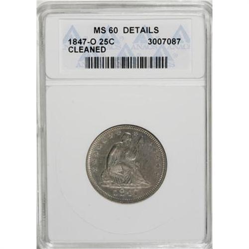 <B>1847-O 25C --Cleaned--ANACS. MS60 Details. </B></I> A scarce issue at all grade levels. Generally bold, except for slight softness in the usual areas, this piece displays even charcoal-gray toning imbued with slight rose and greenish accents. A few wispy marks are observed on each side. Slightly subdued after an ill-advised cleaning. <BR><BR><B>Coin Engraver:</B> Christian Gobrecht<BR><BR><b>Shipping:</b> Coins & Currency (<a target="_blank" href="http://www.heritageauctions.com/common/shipping.php">view shipping information</a>)