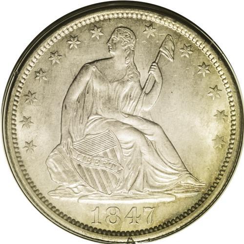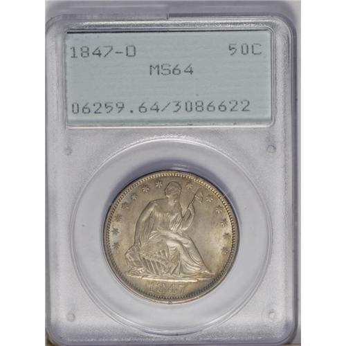 <B>1847-O<50C> MS64 PCGS.</B></I> The 1847-O does not stand out as a scarcity among early New Orleans Mint half dollars and its mintage of nearly 2.6 million pieces is comparatively high. These factors downplay its true scarcity in Choice and better grades. This richly toned example is well detailed save for a bit of localized softness on a few of the obverse stars and on the eagle's left (facing) talons. Variegated shades of pearl-gray, sunset-golden, and blue intermingle over each side in varying degrees. Housed in a first generation PCGS holder. Population at both services: 6 in 64, 5 finer (6/06).
