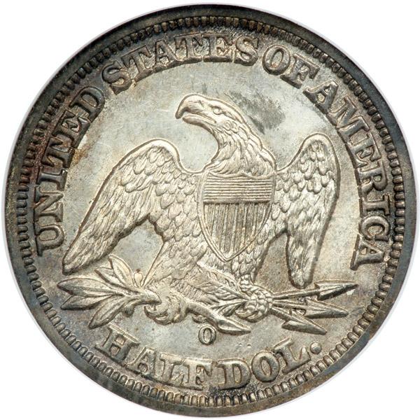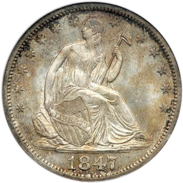 1847-O Liberty Seated Half Dollar. NGC graded MS-64. Well struck with pleasing original toning. The 1847-O does not stand out as anything unusual among early New Orleans Mint half dollars; its mintage of nearly 2.6 million pieces is typical for this decade in American history. These factors obscure its true scarcity in Choice and better grades, however. This attractively toned example is well detailed save for a bit of softness on a few of the upper stars and on the eagle's left (facing) talons. Dappled shades of pearl and gray with russet-golden interact over each side in varying degrees. Pop 2; 5 finer.