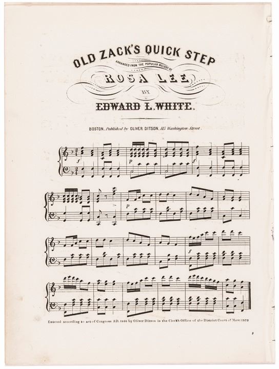 1847 Mexican War Period Sheet Music, titled "Grand Triumphal Quick Step", 3 pages, 9.5” x 13” disbound together with a 2nd sheet musical score. Handsome illustrated front cover displays a large handsome Portrait Bust of “Gen. Zachary Taylor”. Bound together with a second score of music titled, "Old Zack's Quick Step" issued in 1848. This 2nd sheet music is also by White, and published by Ditson, 2 pages, included as part of the overall publication inclusive of the front Portrait cover. Pleasing, clean and well printed, nice for display.
