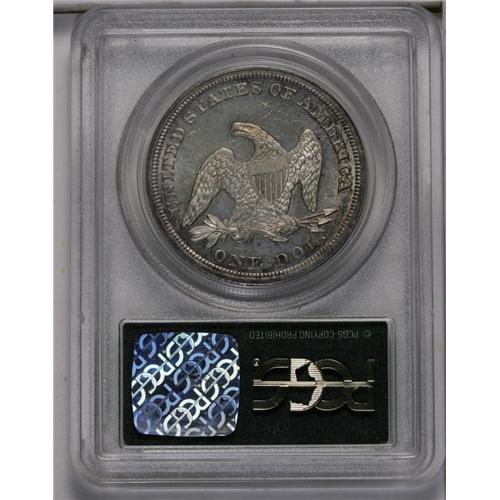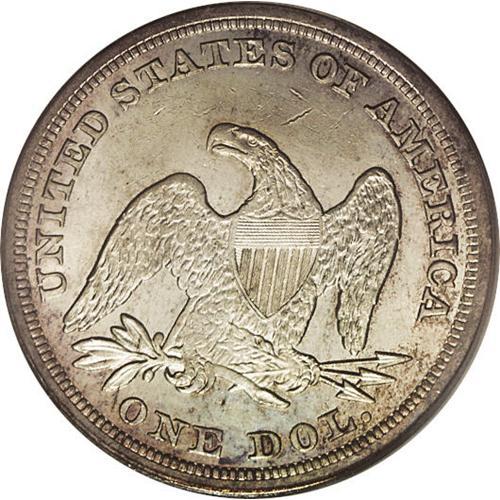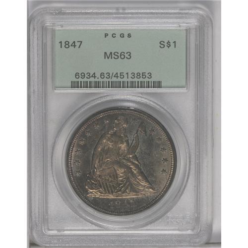 <B>1847<img border='0' src='http://www.heritagecoins.com/images/star.gif' width=10 height=10>$1> MS63 PCGS.</B></I> The 1847 is relatively available in lower grades, but quite rare in the higher Mint State grades. It is often seen heavily bagmarked, accounting for the many more pieces known in lower Uncirculated grades. This lovely piece has only a few trivial surface abrasions on each side that separate it from MS64. The few marks that are present are quite well concealed by medium gray-rose and golden toning that is slightly deeper on the obverse. This example is well struck throughout, with complete head detail and just a little softness on the eagle's plumage and the obverse stars. Housed in an older green-label holder. Population: 17 in 63, 13 finer (6/06).
