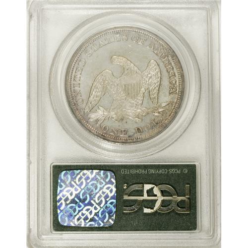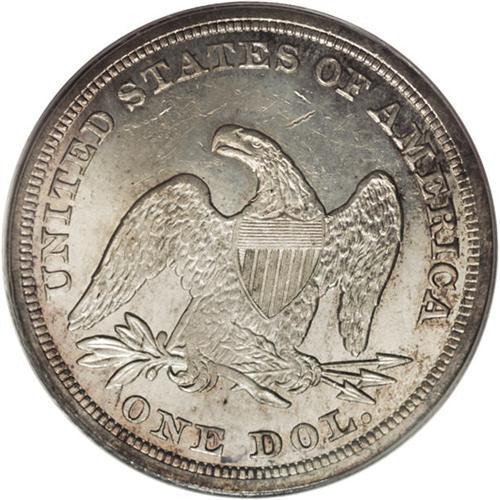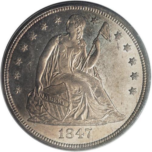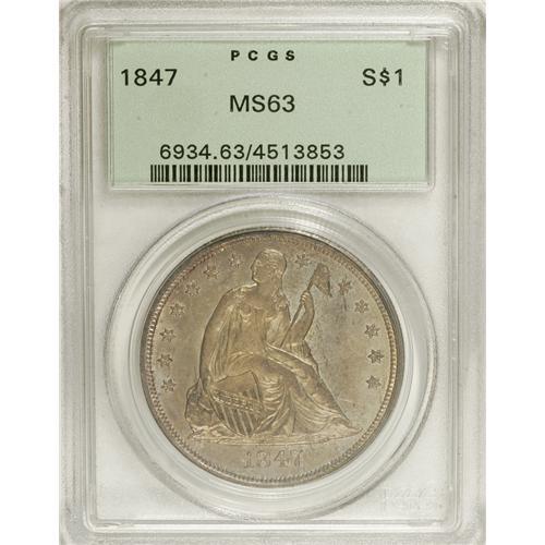 <B>1847 S$1 MS63 PCGS.</B></I> The 1847 is relatively available in VF to AU, but is very scarce in Mint State, and is a prized rarity as a Gem. It is often seen heavily bagmarked, accounting for the many more pieces known in lower Uncirculated grades. This lovely piece has only a few moderate marks on the upper reverse field that separate it from MS64. The semi-prooflike fields display medium gray-rose and golden toning that is slightly deeper on the obverse. This example is well struck throughout, with complete head detail and just a little softness on the eagle's plumage and the obverse stars. Housed in a green label holder. Population: 17 in 63, 12 finer (3/07).<BR><BR><b>Shipping:</b> Coins & Currency (<a target="_blank" href="http://www.heritageauctions.com/common/shipping.php">view shipping information</a>)