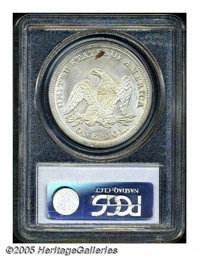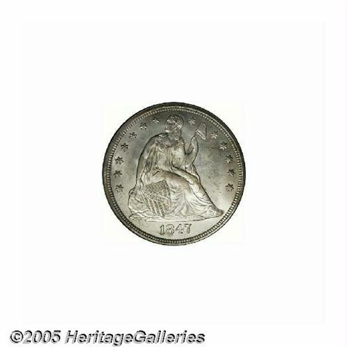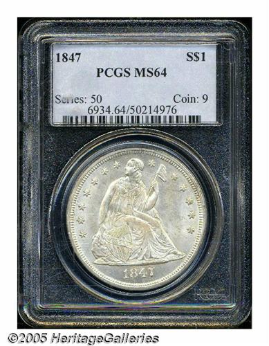 <B>1847<S$1> MS64 PCGS.</B></I> One of the finer examples we have recently seen of this date, the 1847 is relatively available in lower grades, but quite rare in the premium grades of Mint State. It is often seen heavily bagmarked which is the reason so many more pieces are known in lower BU grades. This piece has only a few trivial surface abrasions on each side that separate it from MS65. The few marks that are present are not enhanced by the coin's generally brilliant, untoned appearance. A noticeable grease mark is seen through the ES of STATES. Well struck throughout including complete head detail on Liberty and the eagle's plumage. Population: 6 in 64, 4 finer (6/05).