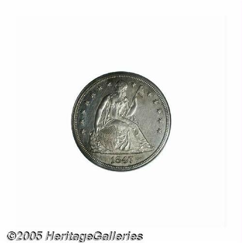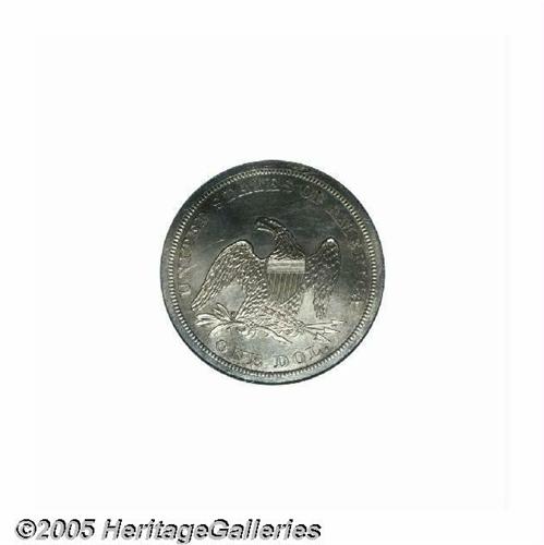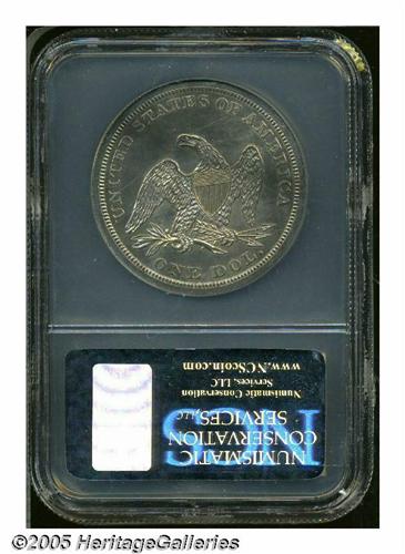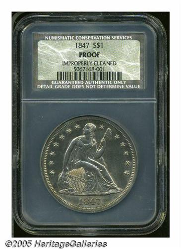 <B>1847<S$1> Proof, Improperly Cleaned, NCS.</B></I> An elusive early proof issue from the Seated dollar series, one of an estimated 20 to 30 pieces struck for the fledgling collector market. Even fewer, perhaps less than a dozen coins, exist today. The bright surfaces on this piece are moderately hairlined and display a thin layer of champagne patina. The design features are sharply defined, with excellent detail apparent in Liberty's hair and sandal.<BR><I>From The Dr. John L. Pellegrini Collection of Liberty Seated Dollars.</B></I>