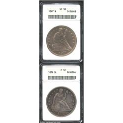1847 S$1 VF30 ANACS, deep dove-gray patina, minor rim dings near 12 o'clock on each side, moderately abraded but LIBERTY is fully legible; and an 1872 Fine 12 ANACS, a well circulated example of this more available issue. 2 coins Important notice: We expect to be auctioning lots at the rate of 200-250 per hour. Sometimes eBay Premier live bid software cannot keep up with that pace, so we strongly recommend that you place a realistic proxy bid now as insurance to avoid disappointment. Also please note that all Heritage/CAA lots purchased through eBay Premier carry a 20% Buyer's Premium. Please make sure you read the Terms and Conditions.
