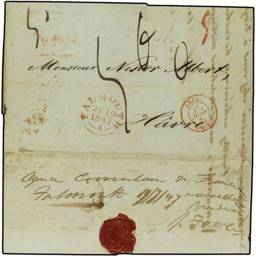 1847 Stampless envelope written from RIO GRANDE to FRANCE, charged "5" routed via England through the French consulate at Falmouth with FALMOUTH transit in red, sent via London with French entry cachet and taxed "60" in manuscript on arrival. Interesting cover.