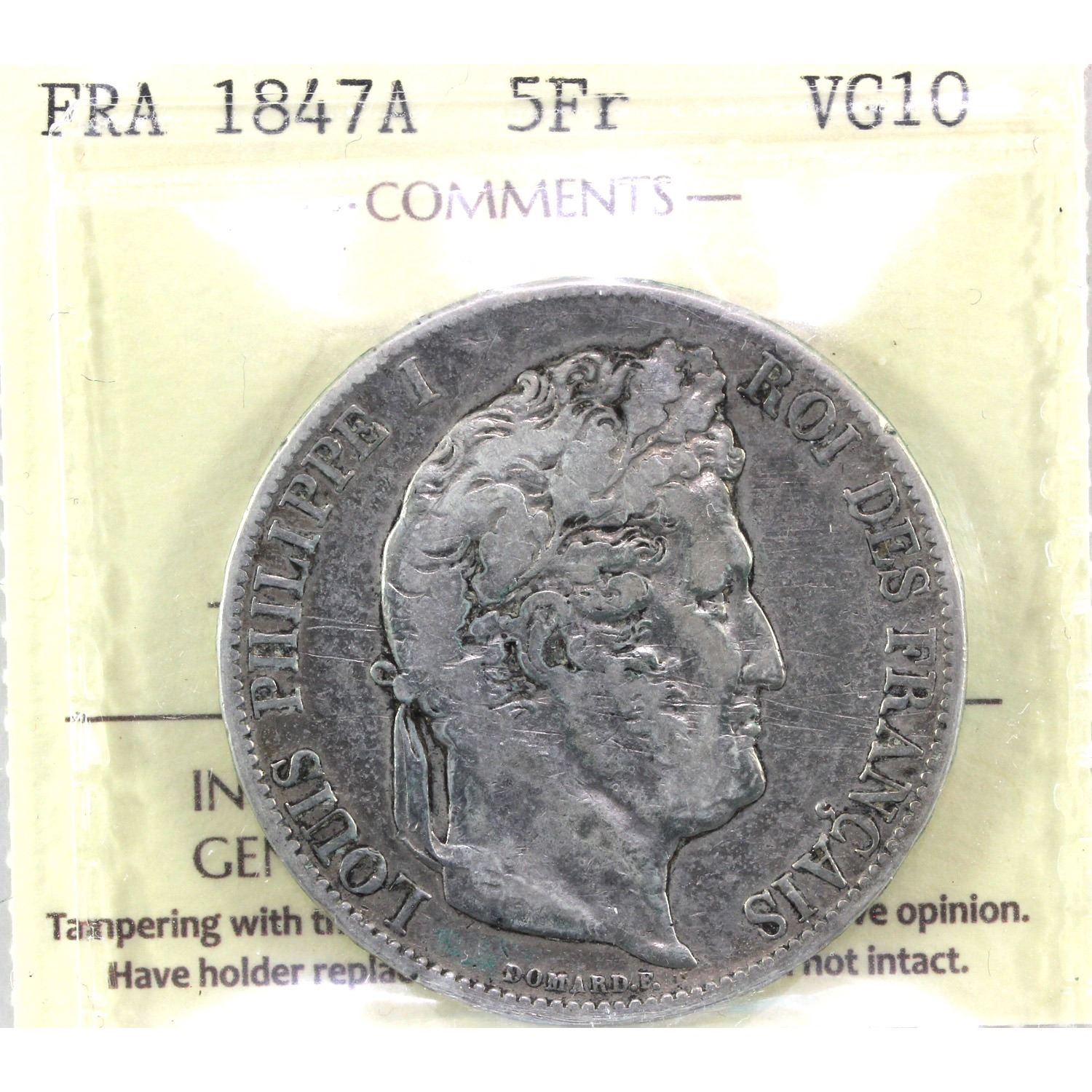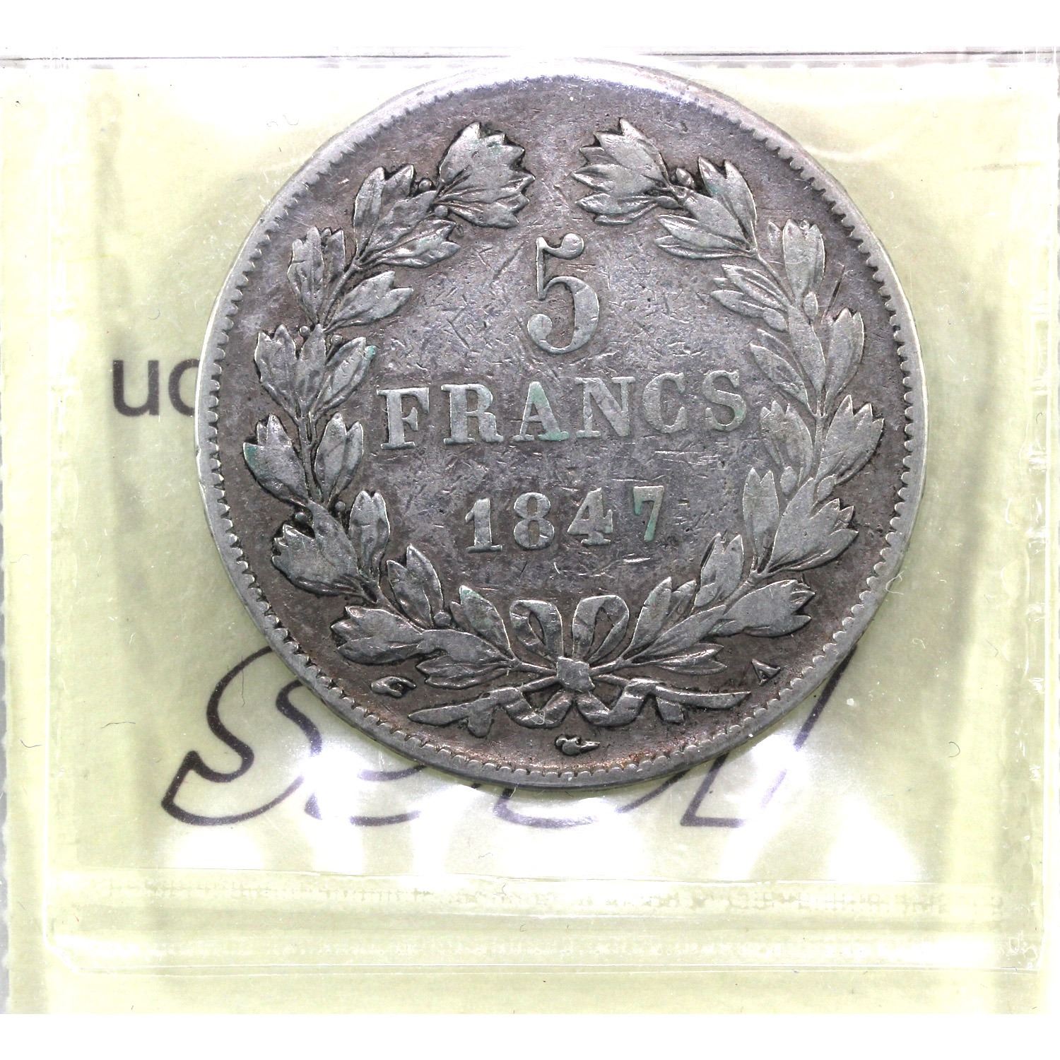1847A France 5 Francs ICCS Certified VG-10.