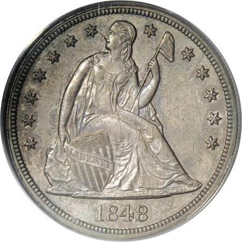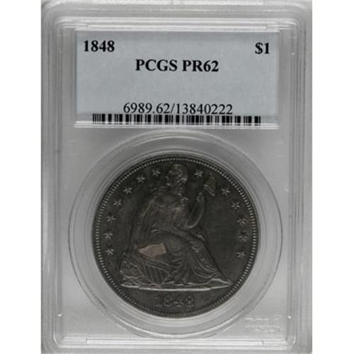 <B>1848 $1 PR62 PCGS.</B></I> Proofs from the 1840s of any denomination are of the utmost rarity, only being struck by the Philadelphia mint at the request of the handful of influential collectors from the period or as a presentation piece for a dignitary or high government official. Experts have estimated the number of 1848 proof dollars issued at between 25 and 35 pieces and it is believed as few as 15-18 specimens survive today as recognizable proofs. This somewhat mishandled specimen is layered in violet-gray patina, with flashes of steel-blue found primarily in the areas surrounding the devices. Light hairlines and contact marks are present on both sides, the most noticeable being an extended mark to the right of the date. Population: 2 in 62, 3 finer (7/07).<BR><BR><BR><B>Coin Engraver:</B> Christian Gobrecht<BR><BR><b>Shipping:</b> Coins & Currency (<a target="_blank" href="http://www.heritageauctions.com/common/shipping.php">view shipping information</a>\)