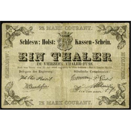 <style type="text/css"> body, td, th { font-family: Arial, Helvetica, sans-serif; font-size: 12px; color: #482424; margin: 0px; padding: 0px; } #header { background-image: url(http://www.bowersandmerena.com/ebay/images/template_v3_01.gif); clear: both; background-color: #590303; border-top-width: 2px; border-top-style: solid; border-top-color: #B38C4F; } #header #header_wrapper { height: 75px; clear: both; width: 800px; margin-right: auto; margin-left: auto; background-image: url(http://www.bowersandmerena.com/ebay/images/template_v3_03.gif); background-repeat: no-repeat; background-position: right; color: #F3EDCC; } #header #header_wrapper #header_logo { float: left; height: 75px; width: 444px; background-image: url(http://www.bowersandmerena.com/ebay/images/template_v3_02.gif); background-repeat: no-repeat; font-size: 10px; text-transform: capitalize; color: #B38C4F; } #header #header_wrapper #header_right { float: left; height: 75px; width: 356px; text-align: right; } #header #header_wrapper #header_right #headerLoginBtn { margin-bottom: 30px; } #header #header_wrapper #header_right input#txtSearch { color: #B49056; border: 1px solid #B49056; width: 175px; padding-top: 3px; padding-right: 3px; padding-bottom: 4px; padding-left: 3px; } #nav { height: 37px; background-image: url(http://www.bowersandmerena.com/ebay/images/template_v3_05.gif); clear: both; } #nav #nav_wrapper { height: 35px; width: 800px; margin-right: auto; margin-left: auto; border-left-width: 1px; border-left-style: solid; border-left-color: #B38C4F; } #nav #nav_wrapper a { padding-right: 15px; padding-left: 15px; border-right-width: 1px; border-right-style: solid; border-right-color: #B38C4F; height: 25px; padding-top: 10px; display: block; float: left; text-decoration: none; font-weight: bold; color: #5D0303; } #nav #nav_wrapper a:hover { color: #B38C4F; } #nav #nav_wrapper #search { float: right; padding-top: 7px; } #nav #nav_wrapper #search #txtSearch { font-family: Arial, Helvetica, sans-serif; font-size: 10px; text-transform: uppercase; color: #D2AE75; border: 1px solid #B38C4F; padding: 3px; } #content_bgd { background-image: url(http://www.bowersandmerena.com/ebay/images/template_v3_09.gif); background-repeat: repeat-y; background-position: center; padding-top: 15px; padding-bottom: 15px; background-color: #FBFBDB; } #content_wrapper { clear: both; height: auto; width: 800px; margin-right: auto; margin-left: auto; } .LotDetailWhite { line-height:normal; font-size:13px; font-family: arial,helvetica,sans-serif; color: White; font-weight: bold; } .LotDetailInformation { line-height:normal; font-size: 13px; font-family: arial,helvetica,sans-serif; } .LotDetailMessage { line-height:normal; font-size: 13px; font-family: arial,helvetica,sans-serif; color: red; } } tr.HeaderAuctionTitle td { color: #000000; font-weight: bold; padding: 2px; background-image: url(http://www.bowersandmerena.com/ebay/images/template_v3_05.gif); background-repeat: repeat-x; border-bottom-width: 1px; border-bottom-style: solid; border-bottom-color: #B38C4F; } table.AuctionSummary a, table.AuctionSummary a:link, table.AuctionSummary a:visited { color: #0000FF; text-decoration: none; } } td.tableHeaderLeft { border-left-width: 1px; border-left-style: solid; border-left-color: #B38C4F; } td.tableHeaderRight { border-right-width: 1px; border-right-style: solid; border-right-color: #B38C4F; } td.tableCellMiddle { border-left-width: 1px; border-left-style: solid; border-left-color: #B38C4F; border-right-width: 1px; border-right-style: solid; border-right-color: #B38C4F; padding: 5px; } tr.footer td { border-top-width: 1px; border-top-style: solid; border-top-color: #B38C4F; } </style> </head> <body> <div id="header"> <div id="header_wrapper"> <div id="header_logo"> </div> <div id="header_right"> </div> </div> </div> <div id="nav"> <div id="nav_wrapper"> <a href="http://www.bowersandmerena.com">Our eBayLive Auctions</a> <a href="#PaymentInfo">Payment Information</a> <a href="#ShippingInfo">Shipping Information</a> <a href="#About">About Bowers and Merena</a> </div> </div> <div id="content_bgd"> <div id="content_wrapper"> <table width="100%" border="0" cellpadding="5" cellspacing="0" class="AuctionSummary"> <tbody> <tr class="HeaderAuctionTitle" style="height: 25px;"> <td align="left" class="tableHeaderLeft" > </td> <td align="center" class="tableHeaderRight"> <span style="font-size: large;">Lot #2824. Specialized Germany. 1848 1 Thaler. Provisional Government Issue. Fine.</span> </td> </tr> <tr> <td colspan="3" class="tableCellMiddle"> PS-771. This piece was an outcome of a revolutionary government that established itself against Danish rule. A One Thaler note in a pleasing Fine grade with nice detail and an attractive layout. The note does have some tape on the reverse as is found on many early notes from private issuers.
