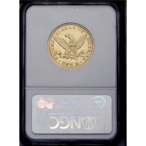 <B>1848<$10> AU55 NGC.</B></I> A shield ring rests atop the second shield stripe. Considerable prooflike luster and an absence of heavy marks makes this scarcer date No Motto eagle impressive for the assigned grade. <BR><BR><B>Important notice:</B> Heritage usually auctions material at the rate of 200-250 lots per hour. On some occasions eBay Live bid software or the Internet may not be able to keep up with the pace of the auction. We recommend placing a realistic absentee bid now as insurance to avoid disappointment. Occasionally the auctioneer may eliminate or reject an eBay Live bid, and the auctioneer may also reopen a lot after the close of the eBay live bidding (usually because we missed an audience bid), and may reject your bid even if it shows you as the winning bidder. By bidding via eBay Live, you agree that Heritage may award the lot to another bidder at its sole discretion under the circumstances described above or any other reasonable circumstances. Since eBay bids are not shown to us until we open the lot on the floor, we treat those bids just like floor bids. In most cases the floor responds before the eBay bid is presented to us, due to Internet lag time, so for consistency we have made it a policy that floor bids are always considered first over tie eBay live bids. Also please note that all Heritage lots purchased through eBay Live carry a 20% Buyer's Premium. Please make sure you read the Terms and Conditions before you bid. This lot is being auctioned in conjunction with a live floor auction by Heritage Galleries & Auctioneers. All final auction and invoice information will be supplied by Heritage Galleries & Auctioneers, and all other information should be considered preliminary. Lot:3927 <BR><BR><B>Winning Notification and Billing:</B> After the FINAL session in this auction is complete, Heritage will send e-mail and snail mail invoices. This process normally takes several days. All final auction and invoice information will be supplied by Heritage Galleries & Auctioneers, and all other information should be considered preliminary. <BR><BR>This auction will be conducted on a live auction floor and over the Internet through eBay Live. If you choose to place an absentee bid, please take a moment to <font color='#0000ff'><u><a href='http://pages.ebay.com/liveauctions/help/before/laabsentee.html'>learn how eBay Live absentee bidding works</a></u></font><font color='#000000'>