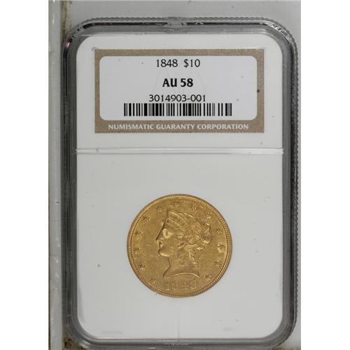 <B>1848 $10 AU58 NGC.</B></I> A few of the deeply hubbed stars have soft centers, but the strike is generally good. Problem-free aside from a minor reverse rim nick at 5:30. Census: 45 in 58, 23 finer (3/07).<BR><BR><b>Shipping:</b> Coins & Currency (<a target="_blank" href="http://www.heritageauctions.com/common/shipping.php">view shipping information</a>)