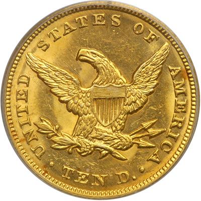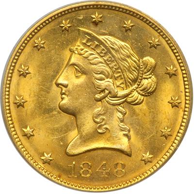 1848 $10 Liberty. PCGS graded MS-64. Lovely golden toning with much luster. Very rare coin in this grade. A spectacular original offering that prides itself on a display of brilliant mint luster and a sharp strike. This is certainly one of the finest known of the date, and it is currently the highest one graded by PCGS as the only Mint State 64 seen by that service. NGC has also graded one as Mint State 64, and another as Mint State 65, to give the buyer an indication of just how rare this date is in the choice grades. The surfaces are remarkably clean for a gold coin of the Gold Rush era. This piece has obviously seen judicious handling since the time it was first taken possession of. If you are a date specialist, or if someone looking for a great example for your type collection, then here is a coin worthy of its grade. Faint wispy hairlines can be seen with a glass, but they are not detracting. Identifiable by a tiny vertical mark on the cheek about half way between the ear and base of Liberty's nose, and a small tick on the lower right loop of the first 8, and on the reverse by a couple of small copper toned areas between AM of AMERICA and UN of UNITED. Pop 1; none finer at PCGS. (PCGS # 8599).
