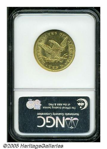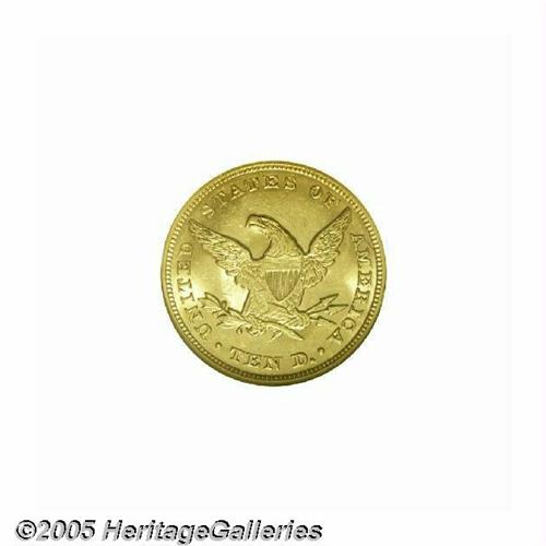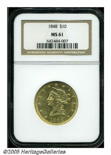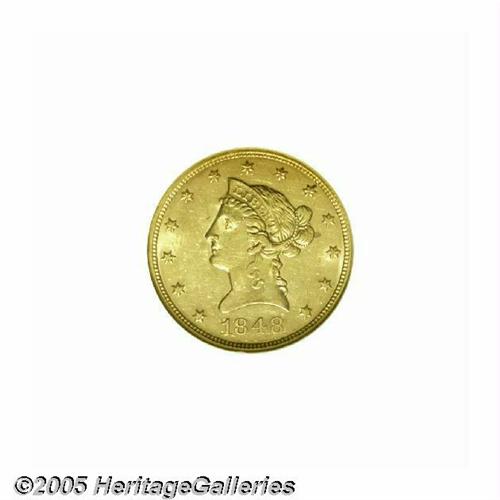 <B>1848<$10> MS61 NGC.</B></I> Any No Motto Eagle is scarce in Mint State, and the 1848 is not a type coin, as it is bounded by the much higher mintage 1847 and 1849 issues. Only the lowest stars are not well struck, and slight incompletion of the strike on the hair near the ear and on the eagle's lower body does not detract from the eye appeal. No relevant marks are present, and luster blazes from the devices and borders. An important opportunity for the rare gold specialist. Population: 10 in 61, 8 finer (5/05).