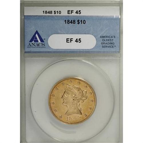 <B>1848 $10 XF45 ANACS.</B></I> . NGC Census: (60/191). PCGS Population (22/53). Mintage: 145,484. Numismedia Wsl. Price for NGC/PCGS coin in XF45: $531. (#8599)<BR><BR><B>Coin Engraver:</B> Christian Gobrecht<BR><BR><b>Shipping:</b> Coins & Currency (<a target="_blank" href="http://www.heritageauctions.com/common/shipping.php">view shipping information</a>)