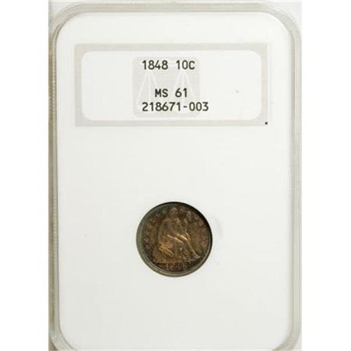 <B>1848 10C MS61 NGC.</B></I> NGC Census: (3/30). PCGS Population (2/22). Mintage: 451,500. Numismedia Wsl. Price for NGC/PCGS coin in MS61: $600. (#4590)<BR><BR><B>Coin Engraver:</B> Christian Gobrecht<BR><BR><b>Shipping:</b> Coins & Currency (<a target="_blank" href="http://www.heritageauctions.com/common/shipping.php">view shipping information</a>)