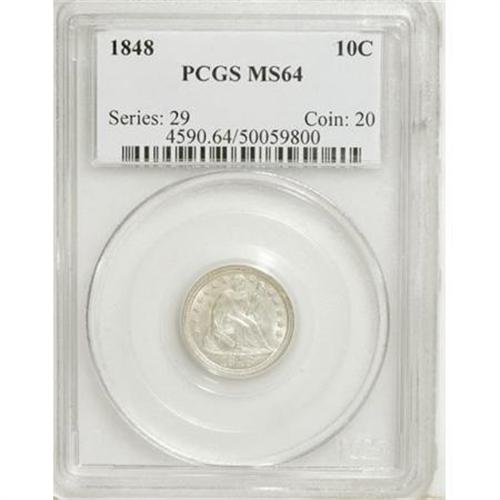 <B>1848 10C MS64 PCGS.</B></I> One of the best representatives of this desirable 1840s dime issue, pleasingly detailed save for a touch of softness at the rightmost stars. Strong, swirling luster enhances the attractively preserved surfaces. A hint of sky-blue patina visits each side, and a dollop of rose-gold appears at the left side of the wreath. Population: 9 in 64, 3 finer (10/07).<BR><BR><B>Coin Engraver:</B> Christian Gobrecht<BR><BR><b>Shipping:</b> Coins & Currency (<a target="_blank" href="http://www.heritageauctions.com/common/shipping.php">view shipping information</a>)
