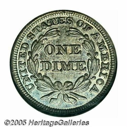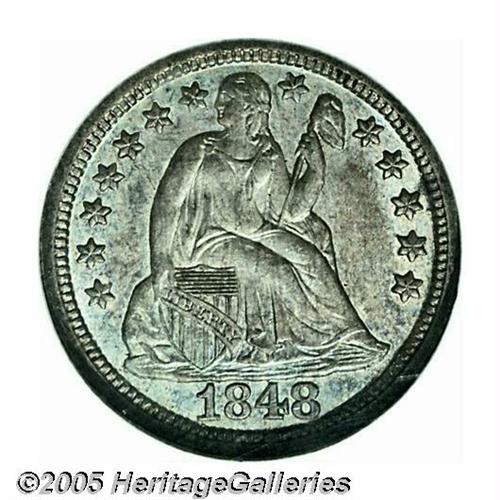 <B>1848<10C> MS65 NGC.</B></I> Well detailed with smooth, satiny surfaces beneath a mixture of rich violet and steel-blue toning. Although not an especially highly regarded issue among Stars Obverse Dimes, Choice and better Mint State representatives are quite scarce. Population: 7 in 65, 1 finer (4/05).