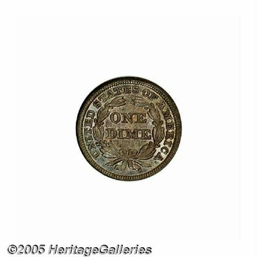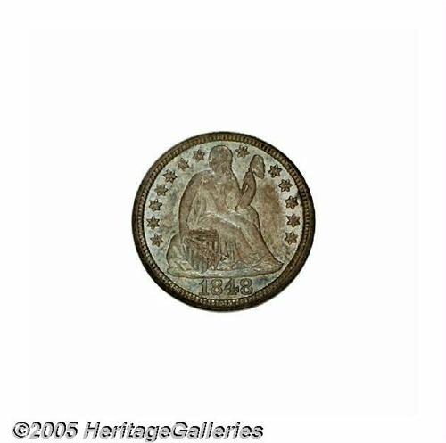 <B>1848<10C> MS65 NGC.</B></I> Well detailed with smooth, satiny surfaces beneath a mixture of rich violet and steel-blue toning. Although not an especially highly regarded issue among Stars Obverse Dimes, Choice and better Mint State representatives are quite scarce. In full Gem grades as seen here, this date is very difficult to obtain. Population: 7 in 65, 1 finer (6/05).