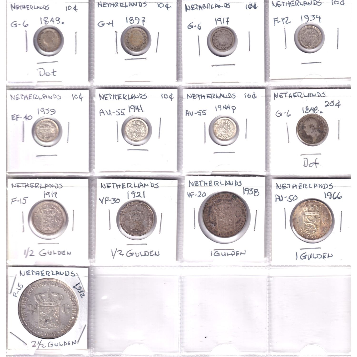 1848-1966 Netherlands 10-cent to 2.5 Guldens From Good to AU Condition. Please view scan for details. 13pcs