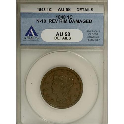 <B>1848 1C --Reverse Rim Damaged--ANACS AU58 Details.</B></I> N-10. NGC Census: (60/301). PCGS Population (18/82). Mintage: 6,415,799. Numismedia Wsl. Price for NGC/PCGS coin in AU58: $140. (#1883)<BR><BR><B>Coin Engraver:</B> Christian Gobrecht<BR><BR><b>Shipping:</b> Coins & Currency (<a target="_blank" href="http://www.heritageauctions.com/common/shipping.php">view shipping information</a>)