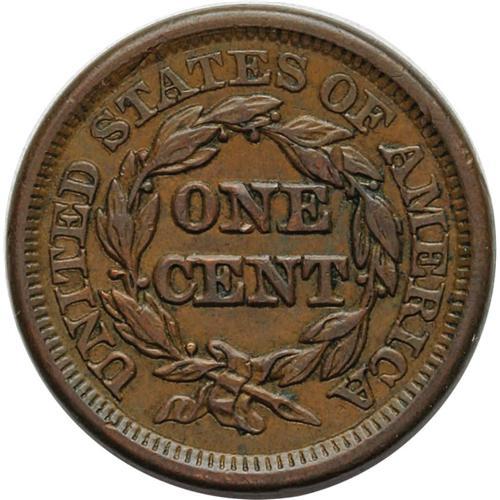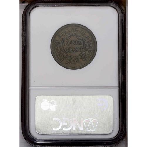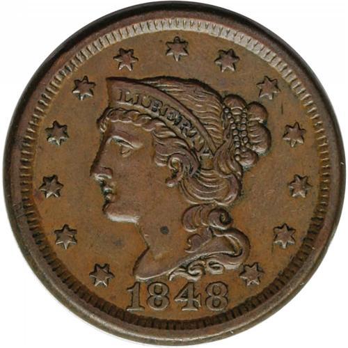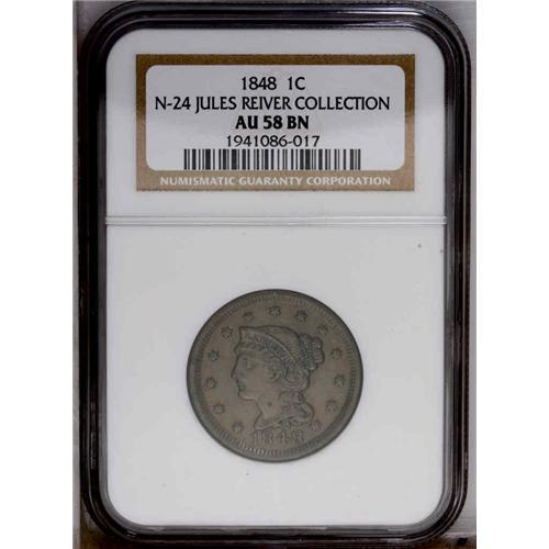 <B>1848<1C> N-24, Low R.5. AU58 NGC. VF30 EAC.</B></I> Grellman state c. The late die state with a vertical line inside N of CENT, but no evidence of the die line up to the right from the top of O in ONE. Considerable swelling or erosion appears on the reverse. Similar die state to Brown: 586 and finer than that coin. An attractive chestnut-brown example with a handful of small contact marks and minor corrosion spots.<BR><I>Ex: Garry Fitzgerald (11/13/1968).</B></I> Envelope Included.