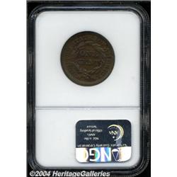 <B>1848<1C> AU58 NGC.</B></I> N-38, Low R.4. Die State A. A glossy golden-brown Cent with glimpses of faded orange color and a blush of lilac patina below STATES. As of (4/04), the present Borderline Uncirculated example is the only piece certified as Newcomb-38 by NGC. <BR><BR><B>Important notice:</B> Heritage usually auctions material at the rate of 200-250 lots per hour. On some occasions eBay Live bid software or the Internet may not be able to keep up with the pace of the auction. We recommend placing a realistic absentee bid now as insurance to avoid disappointment. Occasionally the auctioneer may eliminate or reject an eBay Live bid, and the auctioneer may also reopen a lot after the close of the eBay live bidding (usually because we missed an audience bid), and may reject your bid even if it shows you as the winning bidder. By bidding via eBay Live, you agree that Heritage may award the lot to another bidder at its sole discretion under the circumstances described above or any other reasonable circumstances. Since eBay bids are not shown to us until we open the lot on the floor, we treat those bids just like floor bids. In most cases the floor responds before the eBay bid is presented to us, due to Internet lag time, so for consistency we have made it a policy that floor bids are always considered first over tie eBay live bids. Also please note that all Heritage lots purchased through eBay Live carry a 20% Buyer's Premium. Please make sure you read the Terms and Conditions before you bid.