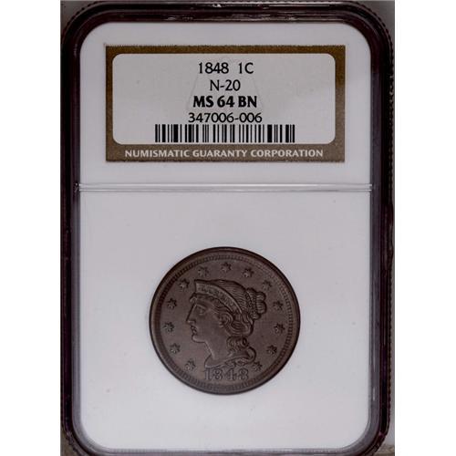 1848 1C MS64 Brown NGC. N-20, R.3. Grellman Die State 1848[1C] MS64 Brown NGC.