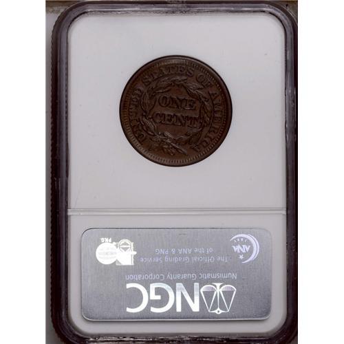 <B>1848<1C> MS64 Brown NGC.</B></I> N-20, R.3. Grellman Die State c. A smooth chocolate-brown representative of this popular repunched date Newcomb variety. Lacquer has affixed a few harmless threads to the fields. Only the upper stars are not well struck. EAC 55.