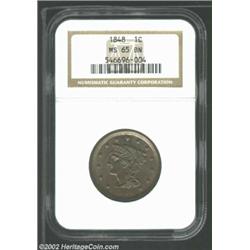 1848 1C MS65 Brown NGC. The devices, denticles, and reverse legends are well struck, while a few obv