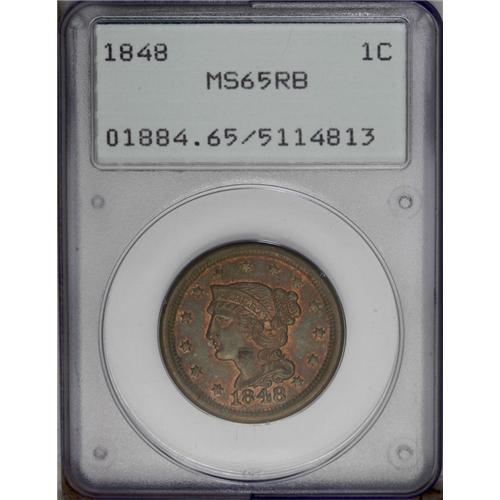 <B>1848 1C MS65 Red and Brown PCGS.</B></I> N-2, High R.1. GDS b. The 18 in the date is clearly repunched. Orange color occupies about half of each side, although the portrait and open fields possess deep steel-blue toning. Some of the obverse stars are soft, otherwise a well struck Gem. Encapsulated in a first generation holder. EAC 63.