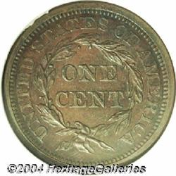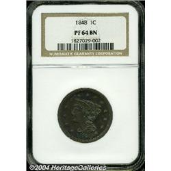 <B>1848<1C> PR64 Brown NGC.</B></I> N-19, R.5. The 1848 Newcomb-19 cent is a proof-only die variety with possibly 35 to 40 examples known, at the high end. This example has an old scratch through Liberty's hair to the E on the headband, a parallel scratch from the R of LIBERTY into the hair behind Liberty's ear, and a third through her nose, mouth, and chin. These have obviously been there a long time as they are so well blended with the balance of the coin so as to be nearly invisible. This cent is boldly struck with reflective fields and outstanding iridescent toning. Lilac and blue are the predominant colors. <BR><BR><B>Important notice:</B> Heritage usually auctions material at the rate of 200-250 lots per hour. On some occasions eBay Live bid software or the Internet may not be able to keep up with the pace of the auction. We recommend placing a realistic absentee bid now as insurance to avoid disappointment. Occasionally the auctioneer may eliminate or reject an eBay Live bid, and the auctioneer may also reopen a lot after the close of the eBay live bidding (usually because we missed an audience bid), and may reject your bid even if it shows you as the winning bidder. By bidding via eBay Live, you agree that Heritage may award the lot to another bidder at its sole discretion under the circumstances described above or any other reasonable circumstances. Since eBay bids are not shown to us until we open the lot on the floor, we treat those bids just like floor bids. In most cases the floor responds before the eBay bid is presented to us, due to Internet lag time, so for consistency we have made it a policy that floor bids are always considered first over tie eBay live bids. Also please note that all Heritage lots purchased through eBay Live carry a 20% Buyer's Premium. Please make sure you read the Terms and Conditions before you bid.