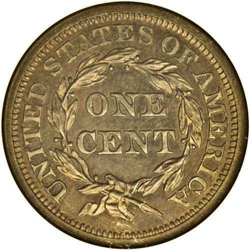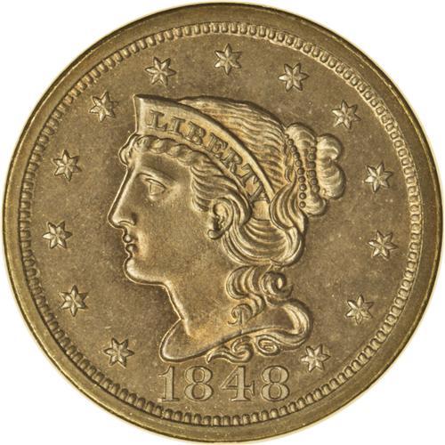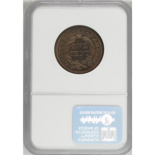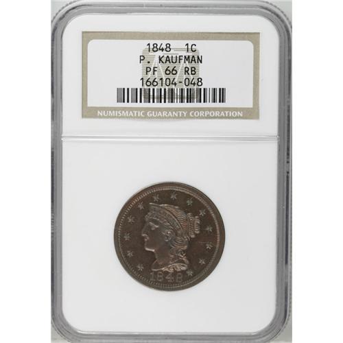 <B>1848<1C> PR66 Red and Brown NGC.</B></I> N-19, Low R.6. Ex: P. Kaufman. A proof only variety with about 25 pieces known. This glorious Gem has impressive quality obverse and reverse surfaces. The date was originally entered in the die with a sharp slant down to the right. The base of a 1 is recut above, the 4 slightly to the left, and the final 8 slightly below. The reverse has a fine die line on the rim over TED, and this same die line can be seen on all of the 1840s proof large cents in this sale. All of these coins were struck from the same reverse die; either the reverse die was saved from year to year for use only on proof coins, or all of these coins were struck at the same time, at some later date. This Gem proof has intermingled orange mint color with hints of blue toning on the obverse and rich reddish-orange color with light blue on the reverse. It is sharply struck with slight cameo contrast. EAC PR63.