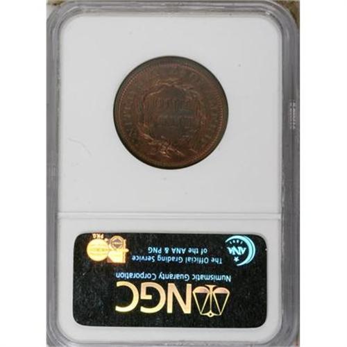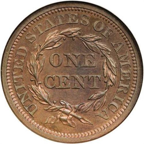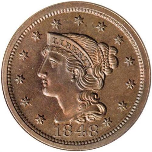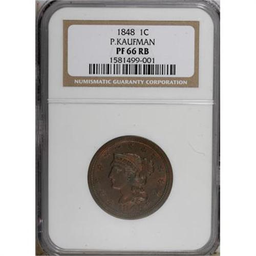 1848 1C PR66 Red and Brown NGC. Ex: P. Kaufman. N-19, Low R.6. A proof only variety. Walter Breen, in his <I>Encyclopedia of United States and Colonial Proof Coins</B></I>, presents a roster of 16 pieces, but then says: " ... I have excellent reason to believe that this enumeration is far from complete." <BR> This Premium Gem has impressive quality obverse and reverse surfaces. There is a fine irregular line across the of 1 in the date just above the base. The reverse has a fine die line on the rim over TED. Intermingled mint orange color with hints of blue toning resides on the obverse, and rich reddish-orange color with light blue on the reverse. It is sharply struck with slight cameo contrast. The surfaces on both sides are well preserved. Census: 2 in 66 Red and Brown, 0 finer (6/07). EAC PR63.<BR><BR><b>Shipping:</b> Coins & Currency (<a target="_blank" href="http://www.heritageauctions.com/common/shipping.php">view shipping information</a>)