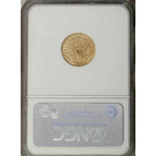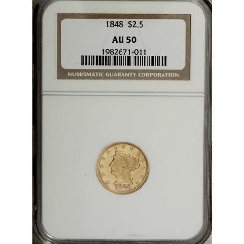 <B>1848 $2 1/2 AU50 NGC.</B></I> This yellow-gold representative is lustrous for the grade, and the strike is good despite some softness on the eagle's neck and left (facing) leg. A minor mint-made strike-through is noted above the cheekbone, and a few wispy marks are present above the portrait. Just 6,500 pieces were struck.<BR><BR><b>Shipping:</b> Coin/Currency (<a target="_blank" href="http://www.heritageauctions.com/common/shipping.php">view shipping information</a>)