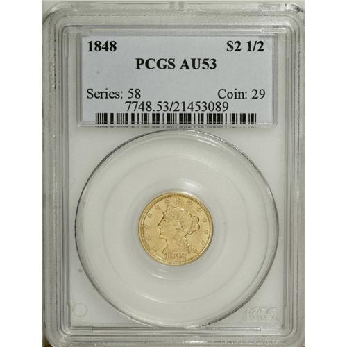 <B>1848 $2 1/2 AU53 PCGS.</B></I> This still-lustrous quarter eagle is yellow-gold with a touch of jade in the fields. Well struck and attractive with light, even wear. Population: 5 in 53, 24 finer (11/06).<BR><BR><b>Shipping:</b> Coin/Currency (<a target="_blank" href="http://www.heritageauctions.com/common/shipping.php">view shipping information</a>)