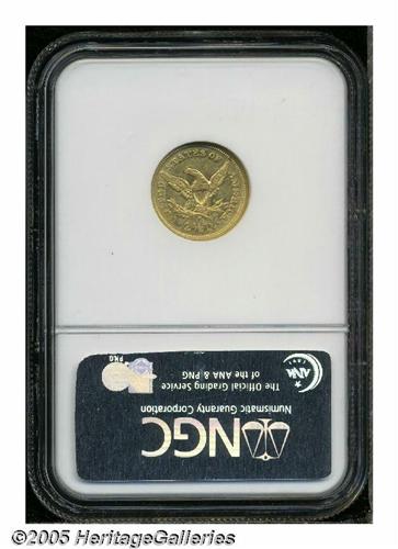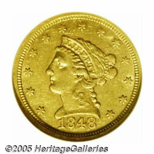 <B>1848<$2 1/2> AU55 NGC.</B></I> This well struck example displays light green-gold coloration, mildly prooflike fields, and minimally worn surfaces that seem abrasion-free. Long recognized as a rare issue, the 1848 is much scarcer than its mintage of 7,497 pieces would necessarily indicate, especially in grades exceeding XF. Population: 5 in 55, 23 finer (4/05).