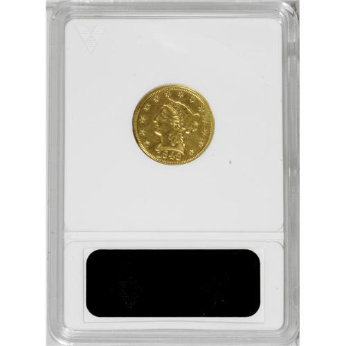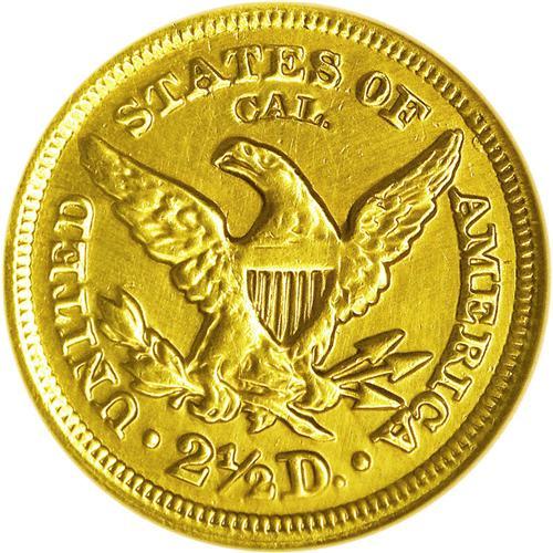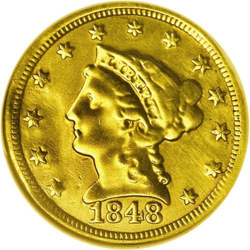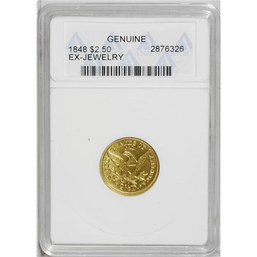 <B>1848<$2 1/2> CAL.--Ex-Jewelry--ANACS. Genuine.</B></I> The CAL. quarter eagle is one of the most famous and popular of all coins of the denomination. Many consider it to be the first commemorative coin as the 1,389 pieces were all struck from the newly discovered deposits of California gold ore found along the American River. This is a typically struck example with the characteristic softness on the eagle's leg. It displays even green-gold color and a somewhat wavy appearance, after being used for a time as a piece of jewelry. Certified only as "Genuine" by ANACS, in our opinion the coin exhibits VF sharpness of detail. No abrasions are seen on either side of the piece.