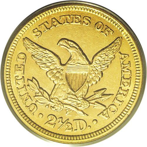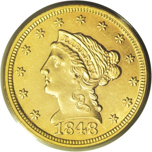 <B>1848<$2 1/2> MS60 PCGS.</B></I> A flashy, semi-reflective example that is one of the few Mint State survivors of this long established rarity among Liberty quarter eagles, from a mintage of just 7,497 pieces. Both sides are tinged in subtle reddish patina and only the feathers on the eagle's left leg (facing) show any appreciable softness. Population: 2 in 60, 6 finer (8/06).<BR><I>From The Della Collection</B></I>