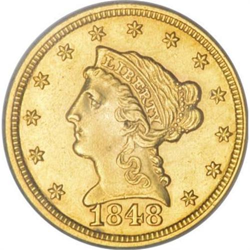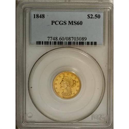 <B>1848 $2 1/2 MS60 PCGS.</B></I> A flashy, semi-reflective example that is one of the few Mint State survivors of this long established rarity among Liberty quarter eagles, from a mintage of just 7,497 pieces. Both sides are tinged in subtle reddish patina and only the feathers on the eagle's left leg (facing) show any appreciable softness. Population: 2 in 60, 6 finer (12/07).<BR><BR><B>Coin Engraver:</B> Christian Gobrecht<BR><BR><b>Shipping:</b> Coins & Currency (<a target="_blank" href="http://www.heritageauctions.com/common/shipping.php">view shipping information</a>)