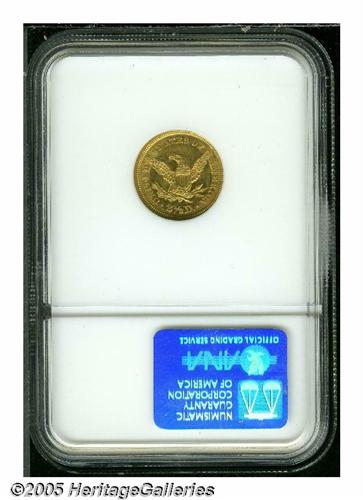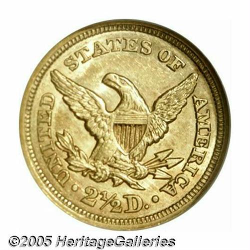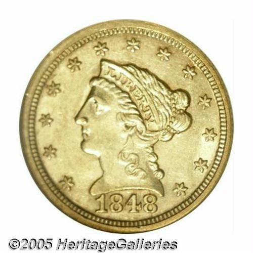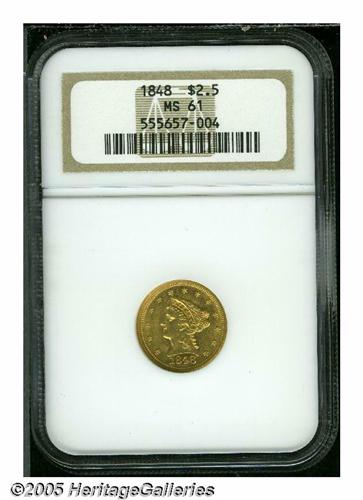 <B>1848<$2 1/2> MS61 NGC.</B></I> This is an extremely popular date for it is the year of the famous CAL quarter eagle, although this is one of the 7,497 examples coined without the countermark. Presumably, this was struck in gold from other sources. Walter Breen noted that Jacob Shapiro, aka J.F. Bell, circulated want lists for this issue in the late 1950s, notifying dealers of the actual rarity of the issue. As a result, some consider this date to be overrated; however, we believe that is not the case. Few Mint State examples are known, as reflected by the population data. It is fascinating to consider the total population of both grading services, for this and the 1848 CAL variety. In MS60 or finer grades, PCGS and NGC have combined to certify just 20 examples of this issue, compared to 47 examples of the 1848 CAL variety! Sharply struck with lovely honey-gold color and reflective fields. Only the eagle's right leg is lacking definition. Population: 5 in 61, 7 finer (5/05).