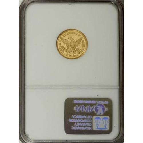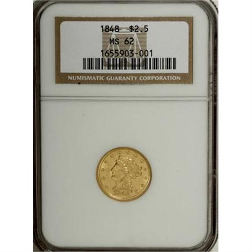<B>1848 $2 1/2 MS62 NGC.</B></I> Boldly struck, save for typical partial weakness on the eagle's neck and left (facing) leg feathers, this pleasing Mint State quarter eagle is lustrous and bright, with wheat-gold and lime-green coloration over both sides. Wispy hairlines and a couple of small abrasions limit the grade. A low-mintage issue; rare in Mint State. Census: 5 in 62, 3 finer (8/07). <BR><BR><B>Coin Engraver:</B> Christian Gobrecht<BR><BR><b>Shipping:</b> Coins & Currency (<a target="_blank" href="http://www.heritageauctions.com/common/shipping.php">view shipping information</a>)