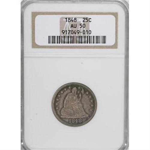 <B>1848 25C AU50 NGC.</B></I> NGC Census: (4/18). PCGS Population (4/13). Mintage: 146,000. Numismedia Wsl. Price for NGC/PCGS coin in AU50: $375. (#5412)<BR><BR><B>Coin Engraver:</B> Christian Gobrecht<BR><BR><b>Shipping:</b> Coins & Currency (<a target="_blank" href="http://www.heritageauctions.com/common/shipping.php">view shipping information</a>)