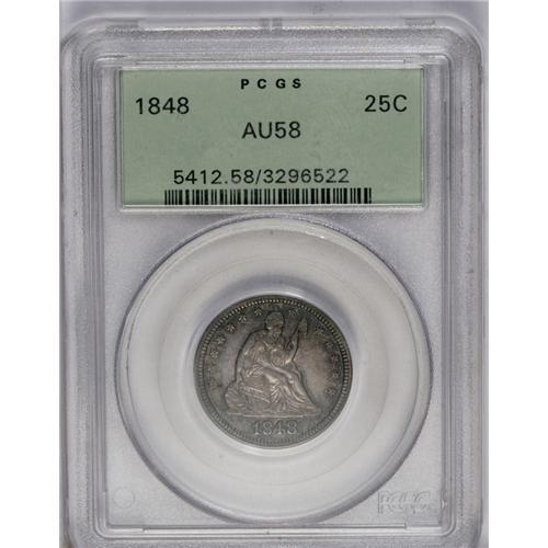 <B>1848<25C> AU58 PCGS.</B></I> Briggs 1-A, Breen-3974. This date is seldom seen above the VF level, perhaps due to speculator melting during the 1850s. The date is boldly repunched west. Well struck and richly toned. A noticeable scratch resides on the left obverse field. Housed in a green label holder. Population: 2 in 58, 5 finer (6/06).