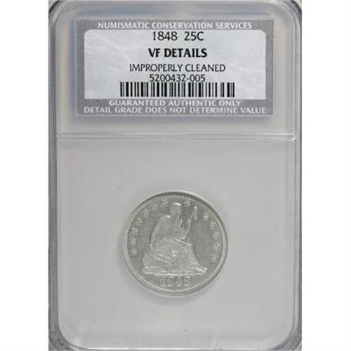 <B>1848 25C --Improperly Cleaned--NCS. VF Details.</B></I> NGC Census: (0/0). PCGS Population (0/0). Mintage: 146,000. (#5412)<BR><BR><B>Coin Engraver:</B> Christian Gobrecht<BR><BR><b>Shipping:</b> Coins & Currency (<a target="_blank" href="http://www.heritageauctions.com/common/shipping.php">view shipping information</a>)