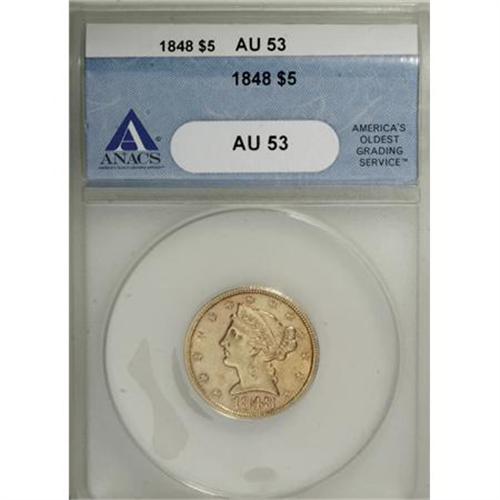 <B>1848 $5 AU53 ANACS.</B></I> . NGC Census: (26/179). PCGS Population (13/55). Mintage: 260,775. Numismedia Wsl. Price for NGC/PCGS coin in AU53: $440. (#8236)<BR><BR><B>Coin Engraver:</B> Christian Gobrecht<BR><BR><b>Shipping:</b> Coins & Currency (<a target="_blank" href="http://www.heritageauctions.com/common/shipping.php">view shipping information</a>)