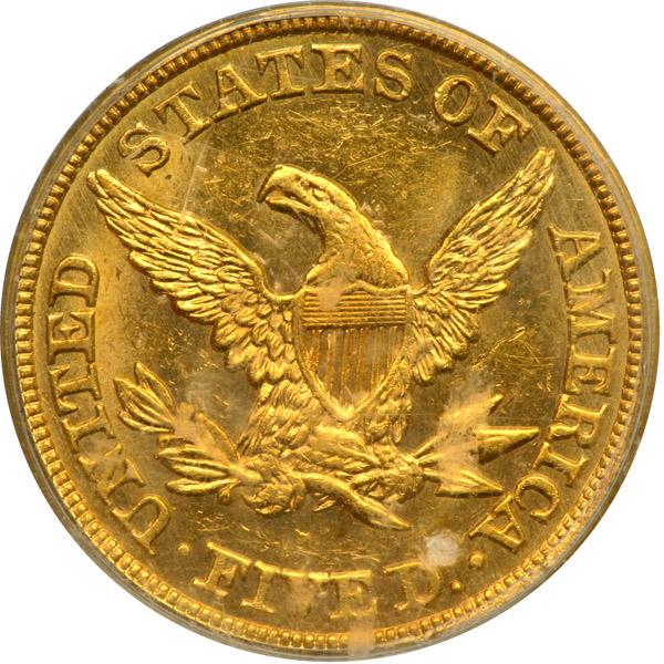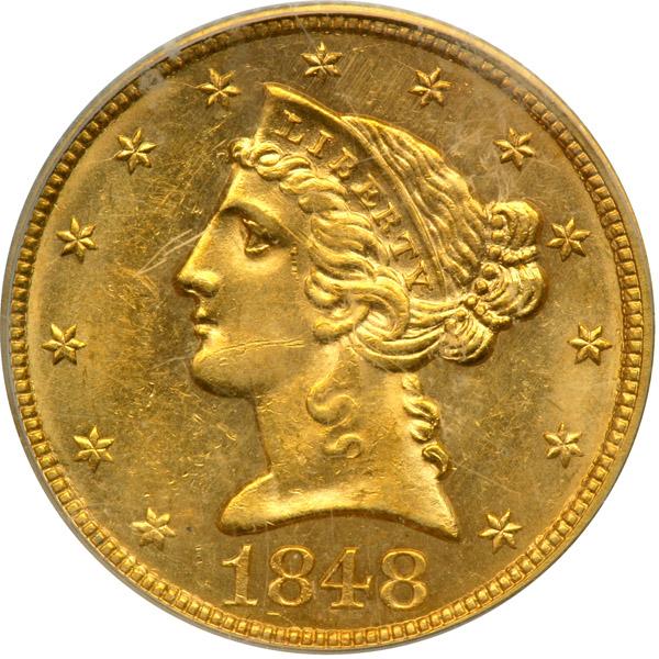 1848 $5 Liberty. PCGS graded MS-63. A nice bold strike with semi reflective surfaces and all, lightly toned. In an old green label holder. A lovely No Motto half eagle. Some faint marks are evident under low magnification, but the overall quality and appeal are both outstanding to the unaided eye. A first-class example of a date whose true rarity is greatly underappreciated. Here is a date that is practically unknown in Mint State despite its liberal mintage figure of 260,775 pieces. It could be many years before a comparable specimen crosses the auction block, or the present piece reappears. Once it sells, we expect it will be off the market for a decade or more. Pop 5; none finer (PCGS # 8236) .