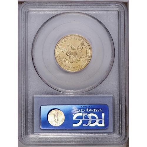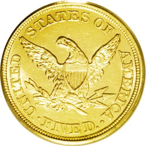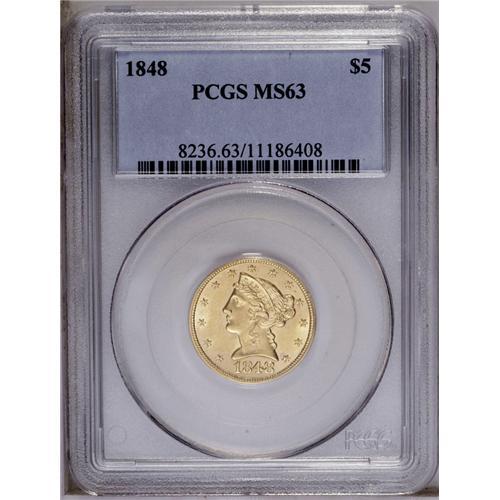 <B>1848<$5> MS63 PCGS.</B></I> In spite of a considerable mintage of more than a quarter-million pieces, the 1848 half eagle is seldom found in XF or higher condition. This example offers wonderful eye appeal, with a bold (although not completely full) strike, pretty honey-gold color, and only light field hairlines and abrasions visible under a loupe. A light obverse die crack proceeds from the rim through the last 8, through the bust truncation and the lovelock to the hair cords. The star centrils are all bold, and the eagle shows only slight weakness on the right (facing) claw and the arrow feathers. Attesting to the condition rarity of this coin, PCGS has graded a total of six examples in MS63, with none finer (3/06). <BR><BR><B>Important notice:</B> Heritage usually auctions material at the rate of 200-250 lots per hour. On some occasions eBay Live bid software or the Internet may not be able to keep up with the pace of the auction. We recommend placing a realistic absentee bid now as insurance to avoid disappointment. Occasionally the auctioneer may eliminate or reject an eBay Live bid, and the auctioneer may also reopen a lot after the close of the eBay live bidding (usually because we missed an audience bid), and may reject your bid even if it shows you as the winning bidder. By bidding via eBay Live, you agree that Heritage may award the lot to another bidder at its sole discretion under the circumstances described above or any other reasonable circumstances. Since eBay bids are not shown to us until we open the lot on the floor, we treat those bids just like floor bids. In most cases the floor responds before the eBay bid is presented to us, due to Internet lag time, so for consistency we have made it a policy that floor bids are always considered first over tie eBay live bids. Also please note that all Heritage lots purchased through eBay Live carry a 20% Buyer's Premium. Please make sure you read the Terms and Conditions before you bid. This lot is being auctioned in conjunction with a live floor auction by Heritage Galleries & Auctioneers. All final auction and invoice information will be supplied by Heritage Galleries & Auctioneers, and all other information should be considered preliminary. Lot:2697 <BR><BR><B>Winning Notification and Billing:</B> After the FINAL session in this auction is complete, Heritage will send e-mail and snail mail invoices. This process normally takes several days. All final auction and invoice information will be supplied by Heritage Galleries & Auctioneers, and all other information should be considered preliminary. <BR><BR>This auction will be conducted on a live auction floor and over the Internet through eBay Live. If you choose to place an absentee bid, please take a moment to <font color='#0000ff'><u><a href='http://pages.ebay.com/liveauctions/help/before/laabsentee.html'>learn how eBay Live absentee bidding works</a></u></font><font color='#000000'>